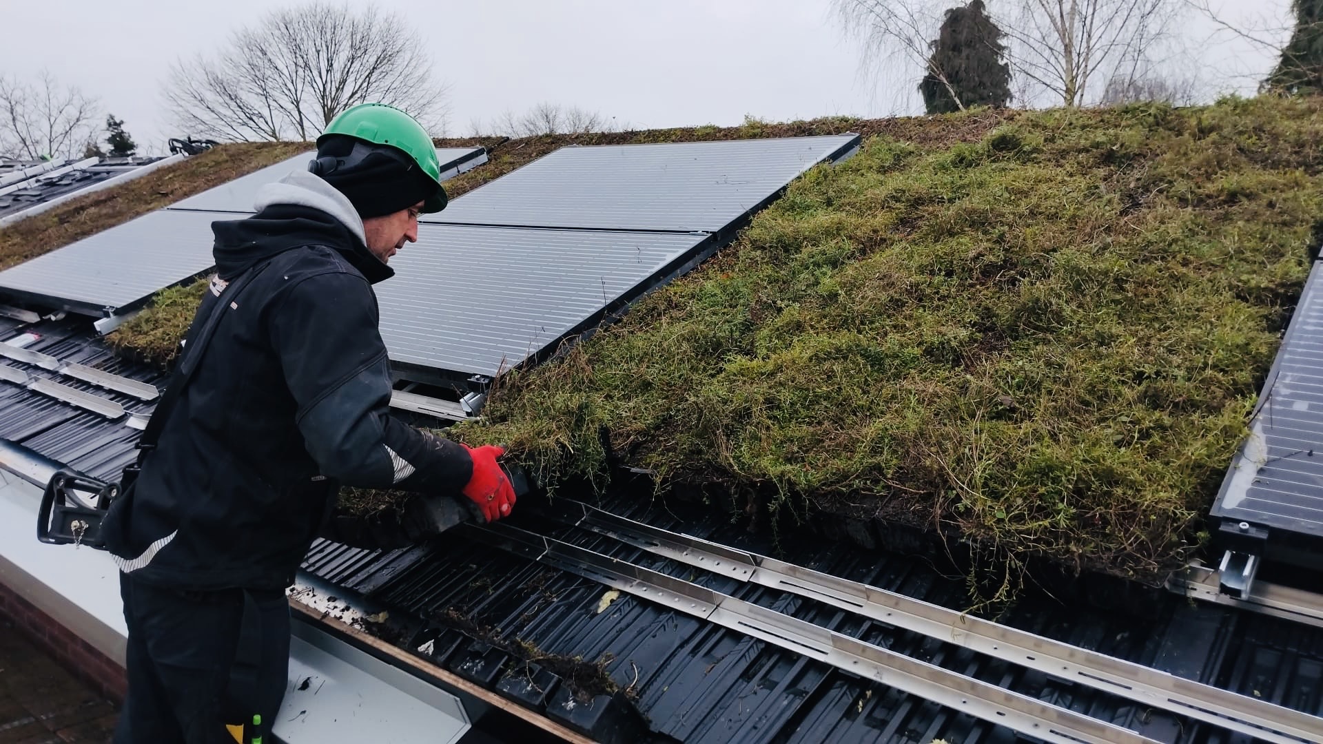 “We halen de oude pannen van het dak, monteren de prefab dakelementen op het bestaande dakbeschot, bevestigen de gootbakken met de nestkasten en plaatsen dan de zonnepanelen en de trays met het groen.”